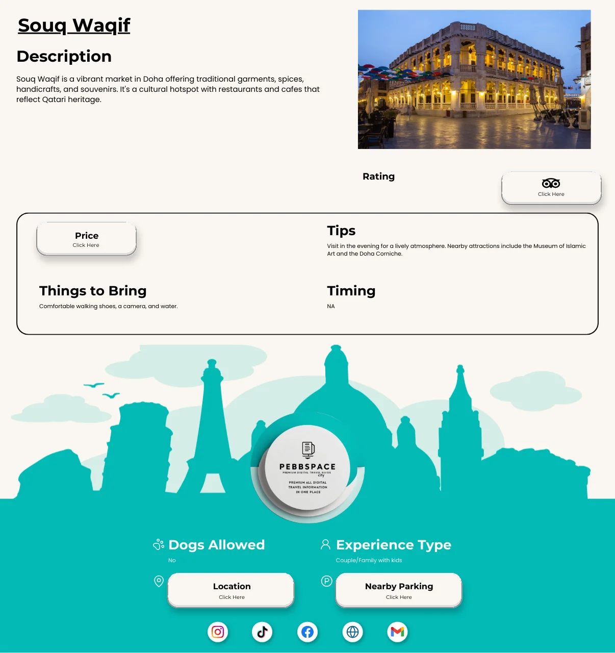 Erkunde das moderne Herz von Katar mit unserem Pebbspace City Guide für Doha! Mit handverlesenen Tipps, architektonischen Highlights und kulturellen Erlebnissen bringt dich dieser Guide direkt an die spannendsten Orte der Stadt. Jetzt herunterladen und Doha hautnah erleben!
