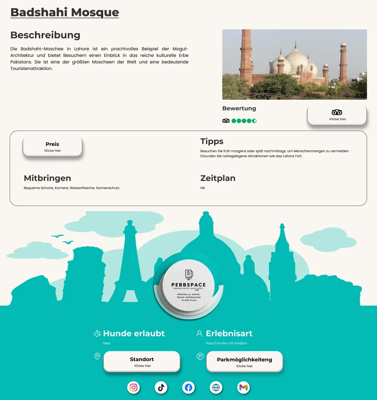 Entdecke das Beste von Lahore mit unserem umfassenden Pebbspace City Guide. Vollgepackt mit Insider-Tipps, beeindruckenden Sehenswürdigkeiten und handverlesenen Empfehlungen ist dieser Guide dein unverzichtbarer Begleiter, um die kulturelle Hauptstadt Pakistans zu erkunden. Egal, ob du Lahore zum ersten Mal besuchst oder die Stadt bereits kennst, unser City Guide hilft dir, versteckte Schätze zu entdecken und das Beste aus deiner Zeit in dieser geschichtsträchtigen Metropole zu machen. Lade ihn jetzt herunter und starte die Planung deines perfekten Lahore-Abenteuers!