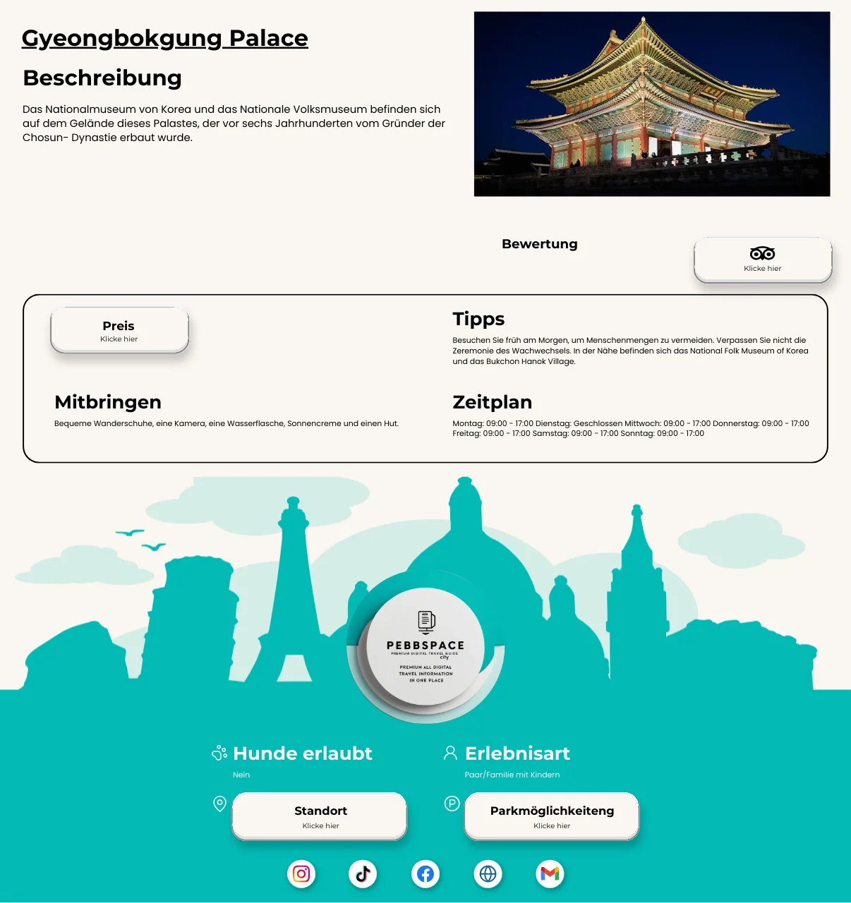 Erkunde das Herz Südkoreas mit unserem Pebbspace City Guide für Seoul! Vollgepackt mit ausgewählten Hotspots, lokalen Tipps und kulturellen Highlights zeigt dir dieser Guide die perfekte Mischung aus Tradition und Technologie – in einer Stadt, die Gegensätze auf faszinierende Weise vereint. Jetzt herunterladen und Seoul entdecken!