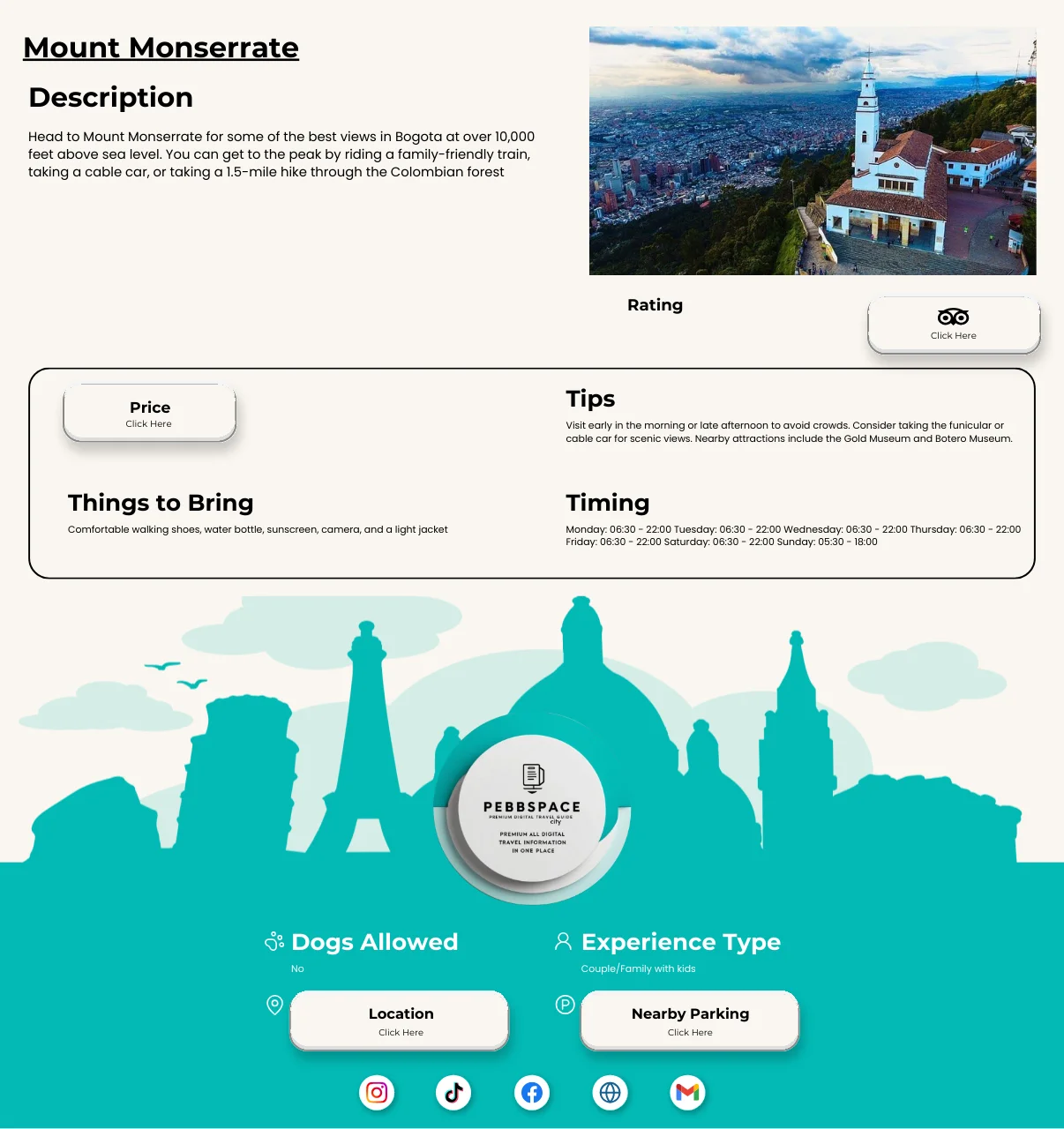 Hol das Beste aus deinem Bogotá-Trip mit unserem Pebbspace City Guide! Mit lokalen Einblicken, Kulturspots und smarten Reiserouten ist dieser Guide dein treuer Begleiter für Kolumbiens facettenreiche Hauptstadt. Jetzt herunterladen und Bogotá entdecken!