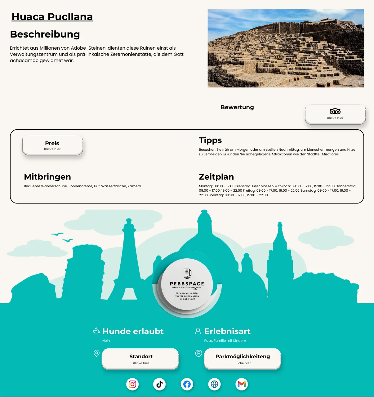 Plane dein perfektes Peru-Abenteuer mit unserem Pebbspace City Guide für Lima! Mit kuratierten Empfehlungen, lokalen Tipps und kulturellen Highlights ist dieser Guide dein Schlüssel zur Entdeckung der charmanten Küstenmetropole. Jetzt herunterladen und Lima wie ein Local erleben!